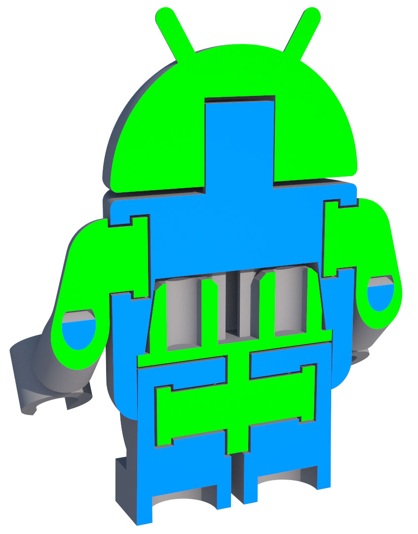 Since I develop mobile phones, I thought it would be cute to have an Android as a minifig. I already had the Lego Stormtrooper as a Rhino 3d model, so it was easy to reuse the arms, hands and legs. The first version had an android vest on top of a standard minifig torso. But the proportions were not quite right, so I did a second version with a custom made torso, with standard arms, neck and leg attachment. The normal legs were too long, so I created a shorter version.